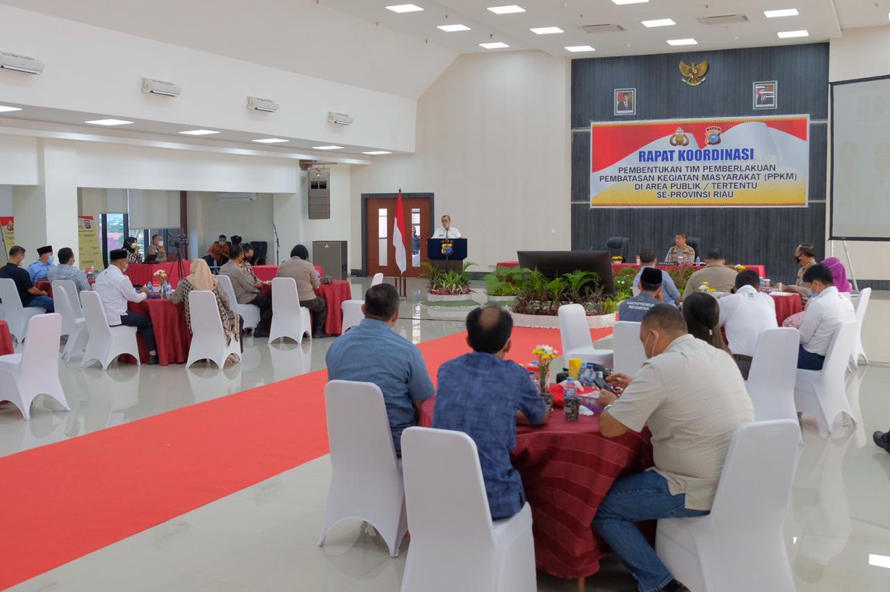 PEKANBARU, datariau.com - Kapolda Riau Irjen Pol Agung Setya Imam Effendi SH SIK MSi menggelar rapat koordinasi posko PPKM Mikro di area publik dan wilayah tertentu Se-Provinsi Riau, di Aula Tribrata lantai 5 Polda Riau Jalan Patimura Nomor 13 Pekanbaru pada Jumat (4/6/2021).