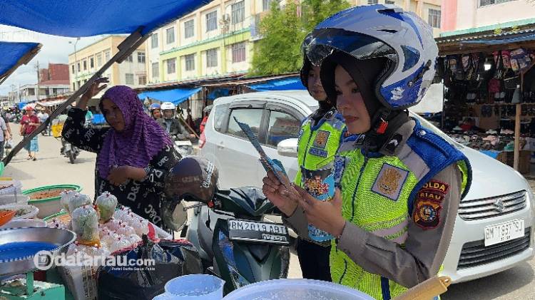 Tampak personel Ditlantas Polda Riau saat menemui salah seorang pedagang di pasar tradisional Kota Pekanbaru, Sabtu (30/12/2023).