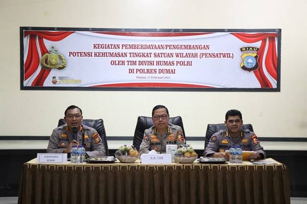 DUMAI, datariau.com - Menguatkan manajeman dan mengoptimalkan bagian Kehumasan, Divisi Humas Mabes Polri memberikan penyegaran dan pemahaman tentang tugas dan fungsi kemuhamasan kepolisian kepada Polres Dumai, Polres Kabupaten Bengkalis, Polres Kabupaten Kepulauan Meranti dan Polres Kabupaten Rokan Hilir beserta jajaran Polsek dari Polres yang ada di zona ini.