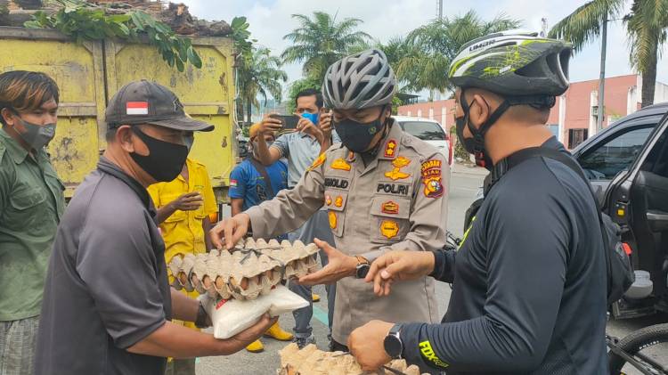 Gunakan Sepeda Patroli, Kapolres Kampar Bagikan Sembako di Bangkinang Kota