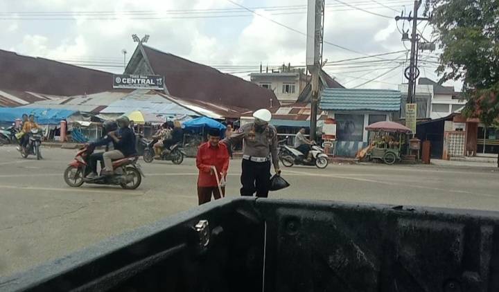 Kanit Lantas Polsek Tualang Iptu Akhir Ramadhan SH MSi bersama personil Unit Lantas Polsek Tualang giat 'Jumat Barokah'.