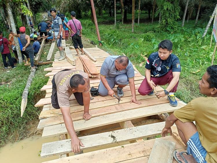 Jembatan Penghubung Dua Desa Rusak Diterjang Banjir, Polsek Batang Gansal Inhu Goro Bersama Warga