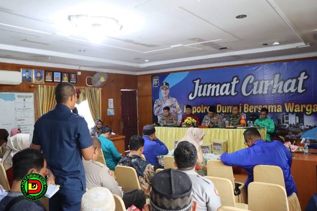 “Melalui program Jumat Curhat diharapkan mampu menciptakan dan menjaga kondusifitas wilayah Kota Dumai, dan kita dengarkan keluhan-keluhan serta masukan dari masyarakat khususnya untuk kemajuan Kota Dumai maupun kemajuan institusi Polri baik di bidang pelayanan kepada masyarakat, sebagai pelindung, pengayom dan pelayan masyarakat,” harap Kapolres Dumai AKBP Nurhadi Ismanto.