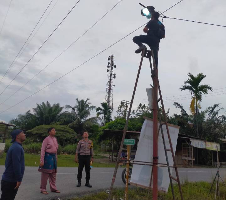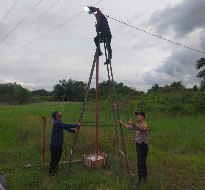 Bhabinkamtibmas Polsek Tualang Aipda Dian Prastiadi SH dan Kepala Desa Pinang Sebatang Arizal SH pantau pemasangan lampu penerangan jalan.
