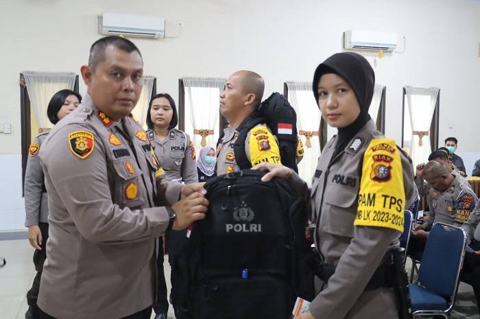 Menghitung hari jelang proses pemungutan dan penghitungan suara Pemilihan Umum (Pemilu) 2024, Kapolres Dumai melakukan pengecekan sikap tampang personel Polres Dumai serta secara simbolis menyerahkan perlengkapan berupa tas/ransel, buku saku Pam TPS dan ban lengan personel Pam TPS sebagai prasarana pendukung personel dalam melaksanakan tugas pengamanan di TPS.