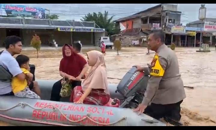 Kapolres Rohul Dorong Perahu Karet Ibu Hamil Korban Banjir Untuk ke Bindan