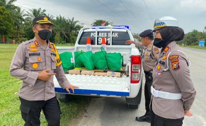 Kapolres Siak, AKBP Ronald Sumaja SIK di dampingi Kasat Lantas Polres Siak, AKP Viola Anggreni SIK bagikan bansos Bhayangkara.