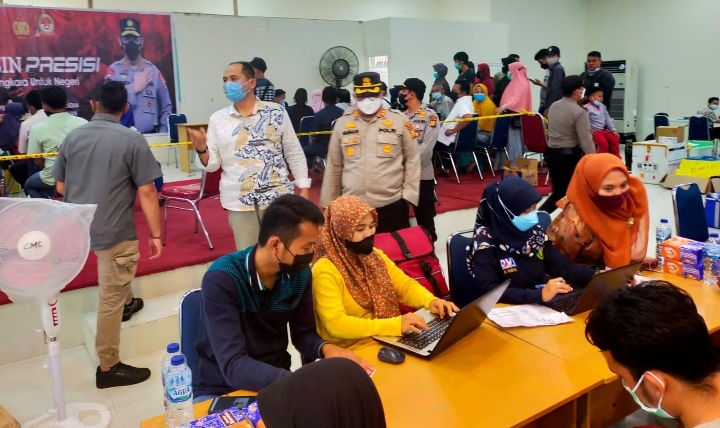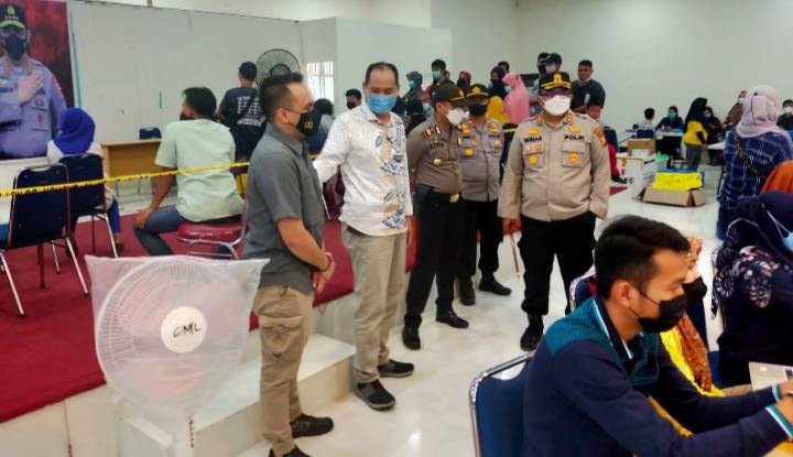 Kapolres Siak AKBP Gunar Rahadiyanto SIK tinjau pelaksanaan vaksinasi massal di aula mess Bunut PT. IKPP Perawang di damping Kabag Bin Ops Ditreskrimsus Polda Riau AKBP M Agus Hidayat SH SIK.