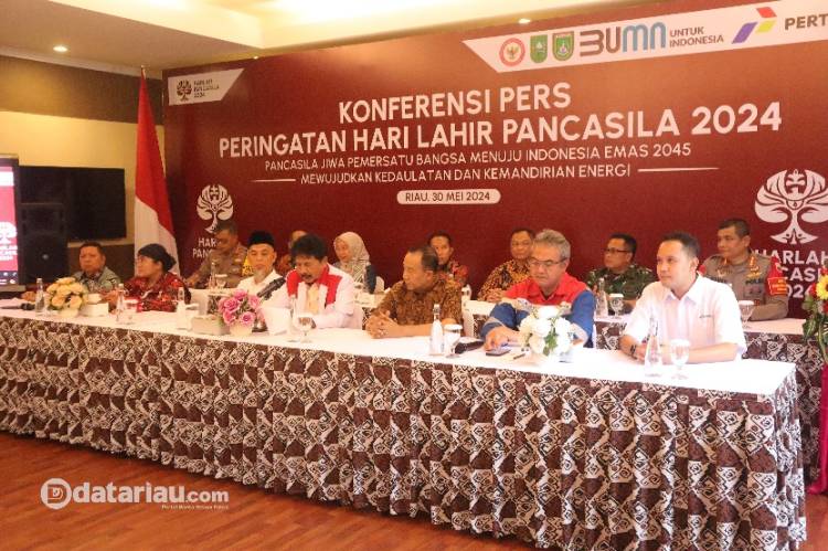 Karo Ops Polda Riu Kombes Pol Roni Lumban Gaol didampingi Kabid Humas Kombes Pol Hery Murwono saat hadir di Konferensi Pers peringatan hari lahir Pancasila 2024 di Kota Dumai, Kamis (30/5/2024).