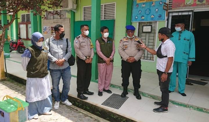 Kasatpol Airud Polres Siak Kompol Afril di dampingi Bhabinkamtibmas Polsek Tualang Bripka Arya Sudarsa dan Kepala Puskesmas Tualang dr Armen dan tenaga kesehatan di SMAN 5 Tualang.
