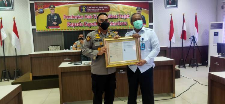 Foto : Kapolresta Pekanbaru Kombes Pol Dr Pria Budi SIK MH saat menerima Hak Atas Kekayaan Intelektual (HAKI) yang diserahkan langsung Kepala Kantor Wilayah K