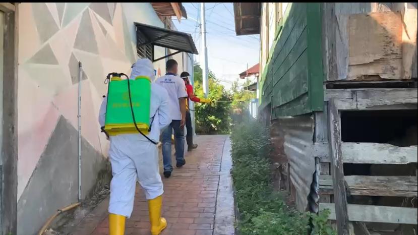 Keterangan Foto : Bhabinkamtibmas Polsek Limapuluh Aiptu M Hatta Menggunakan APD, Saat Persiapan Menyemprot Disinfektan Kerumah Warga-warga di Kelurahan Pesisir, Kecamatan Limapuluh, Kamis (17/6/2021).