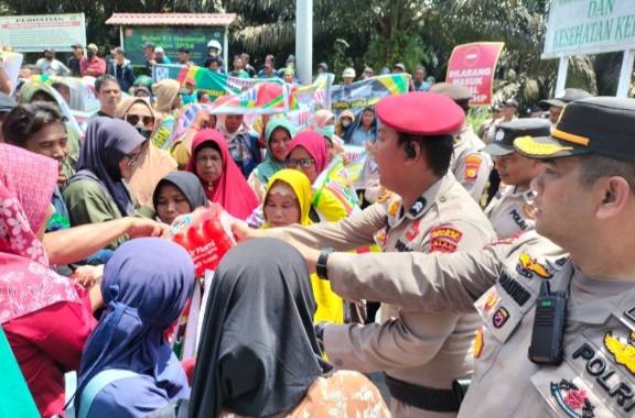 Momen Polisi Bagikan Minuman Kepada Masyarakat Saat Demo PT AIP Tualang