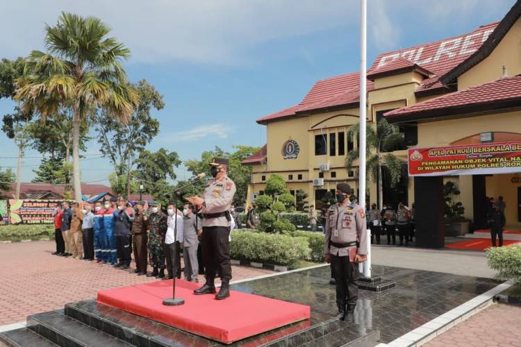 PEKANBARU, datariau.com - Kapolda Riau Irjen Agung Setya Imam Effendi, memimpin apel gelar pasukan skala besar, untuk pengamanan objek vital nasional di Rokan Hilir pada Rabu (13/10/2021). Rokan Hilir merupakan wilayah vital dalam eksplorasi blok rokan.