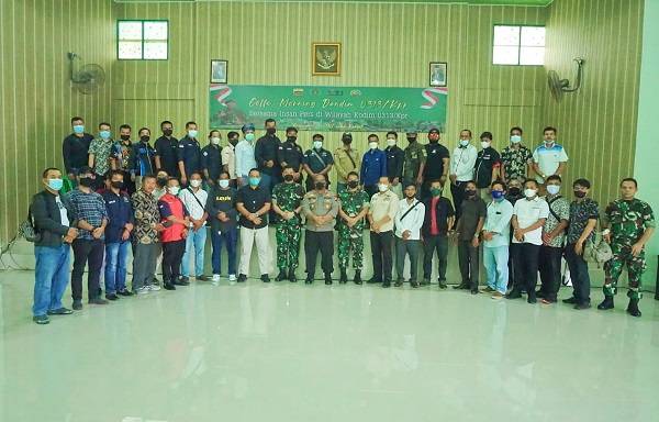 Dandim 0313/KPR Letkof Inf Leo foto bersama para wartawan di sela-sela kegiatan Coffe Morning di Markas Kodim 0313/KPR Jalan Jendral Sudirman,