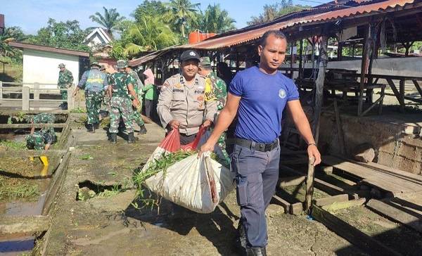 Antisipasi Banjir, TNI Polri dan Masyarakat di Rohul Gotong Royong Bersihkan Drainase Pasar