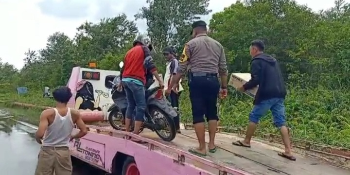 Personil Polsek Bungaraya Pasang spanduk imbauan bagi pengendara yang melintas ke Siak-Buton KM 28.