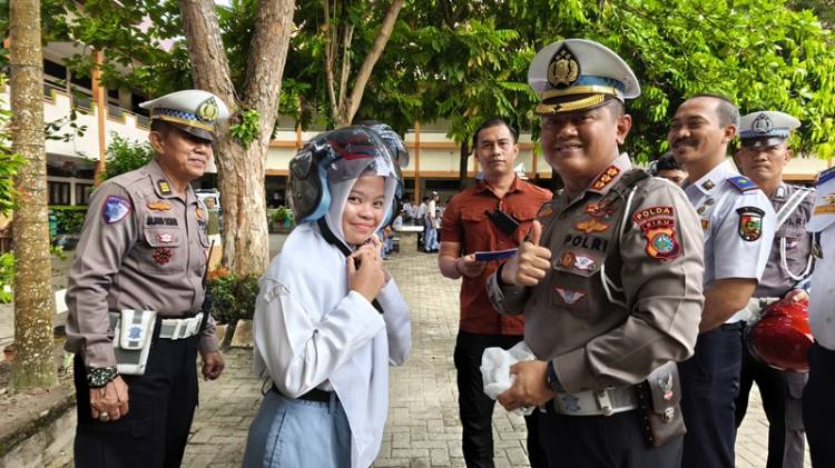 Direktorat Lalu Lintas Polda Riau menggelar program Police Go to School di SMKN 7 Pekanbaru pada Senin (5/5/2025).