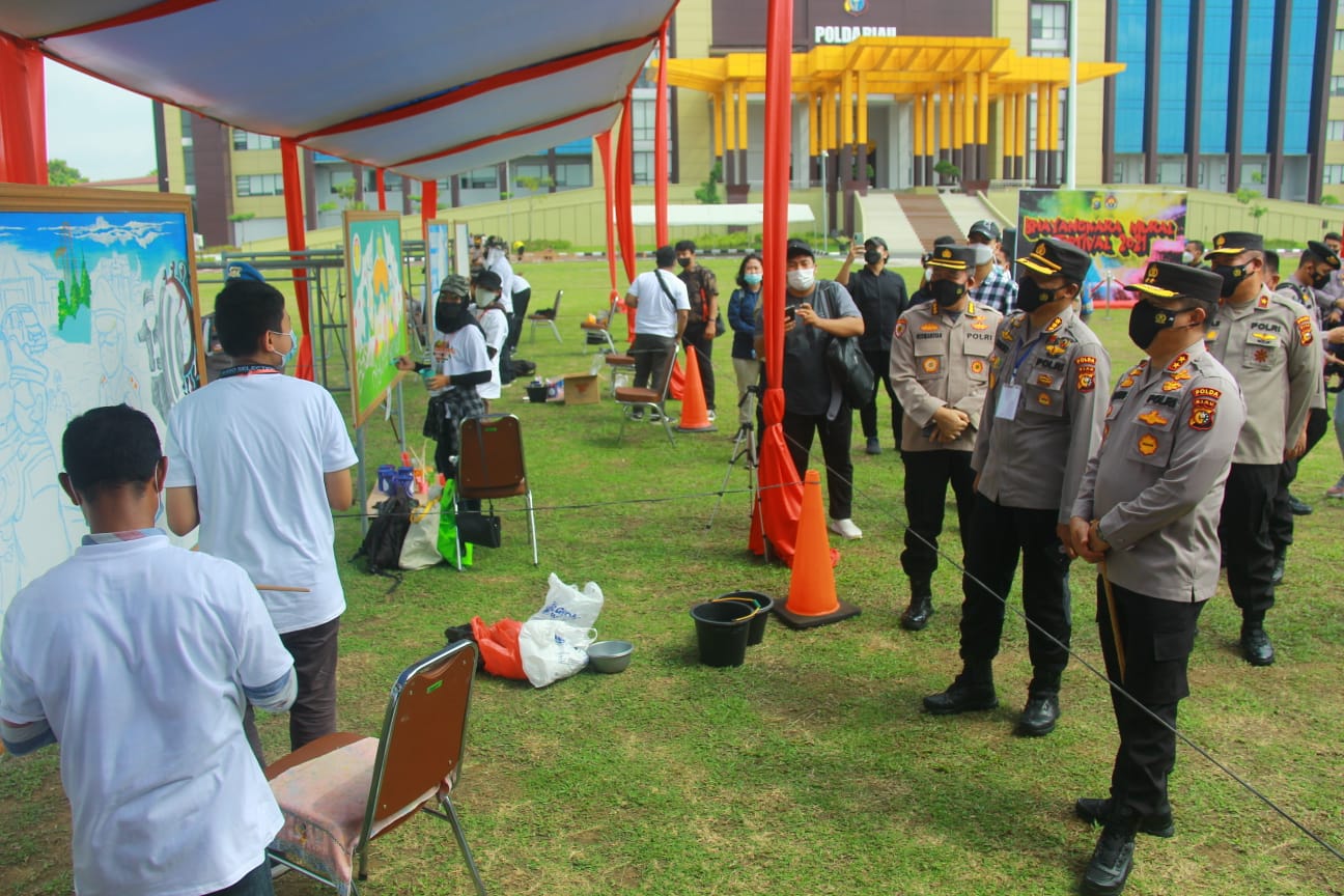 PEKANBARU, datariau.com - Kepolisian Daerah (Polda) Riau menggelar Festival Mural 2021 pada Sabtu (30/10/2021), dihalaman Mapolda Riau, waktu yang bertepatan dengan HUT Humas Polri ke-70.