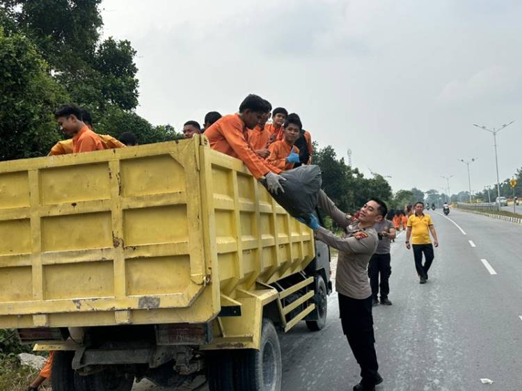 Polisi Gotong Royong Angkut Sampah di Sepanjang Jalan Desa Balam Jaya