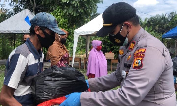 Kapolres Siak AKBP Doddy F Sanjaya SH SIK MH bersama rombongan membagikan masker kepada masyarakat di Tualang, dan bahan pokok makanan bertempat di Dusun Harapan Baru, Kampung Pinang Sebatang, Kecamatan Tualang, dengan cara menyambangi rumah rumah masyarakat yang diketahui melaksanakan isolasi mandiri.