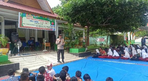 Bhabinkamtibmas Pinang Sebatang Barat Aipda Benny Beben sosialisasi lalu lintas di SMPN 7 Tualang, dalam rangka Ops Patuh LK 2025.