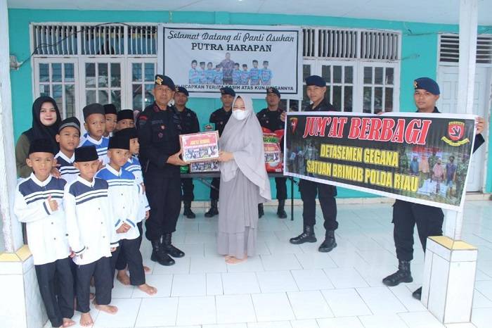 Program Jumat Berbagi, Personel Gegana Riau Bagikan Paket Sembako Untuk Anak Panti Asuhan Putra Pekanbaru