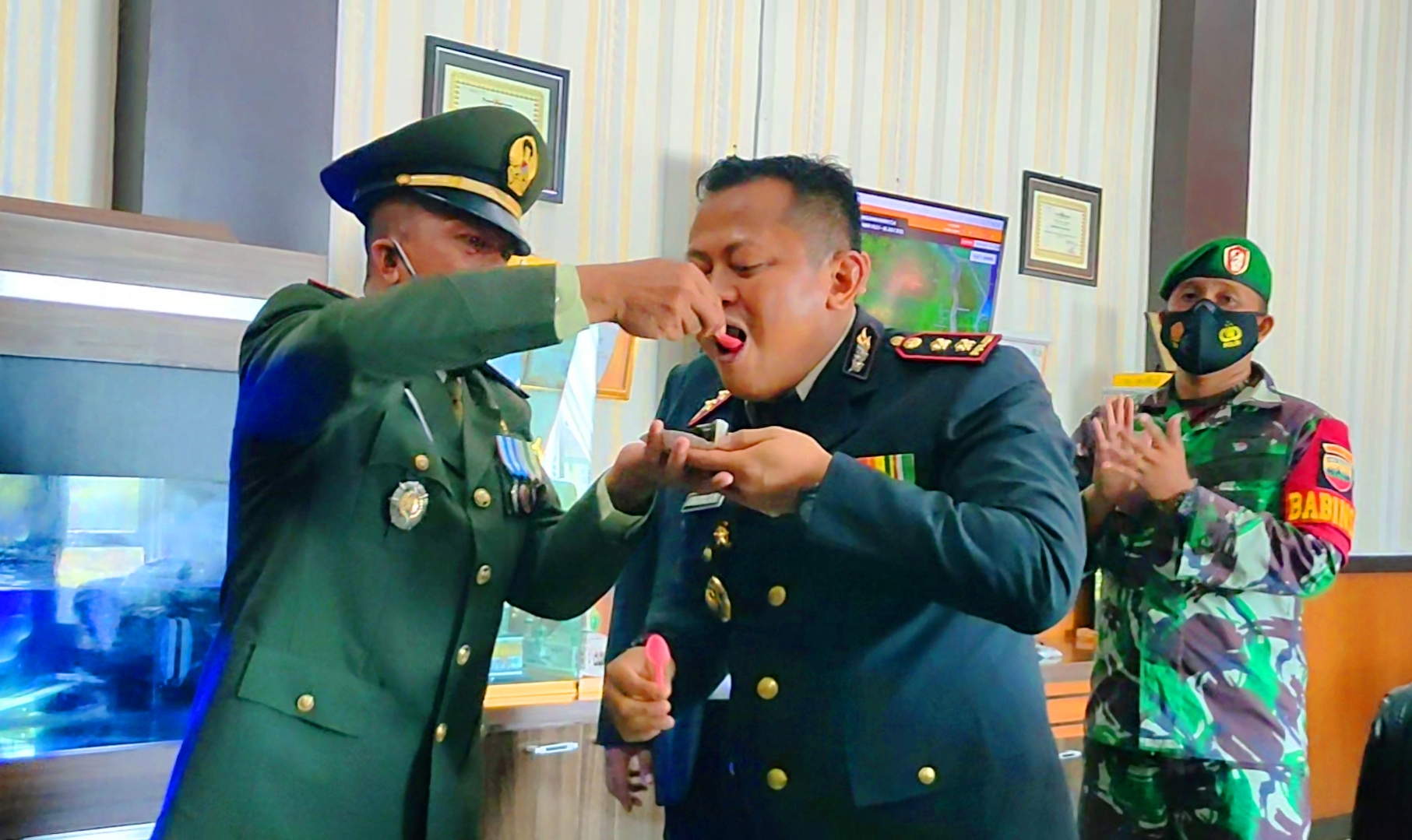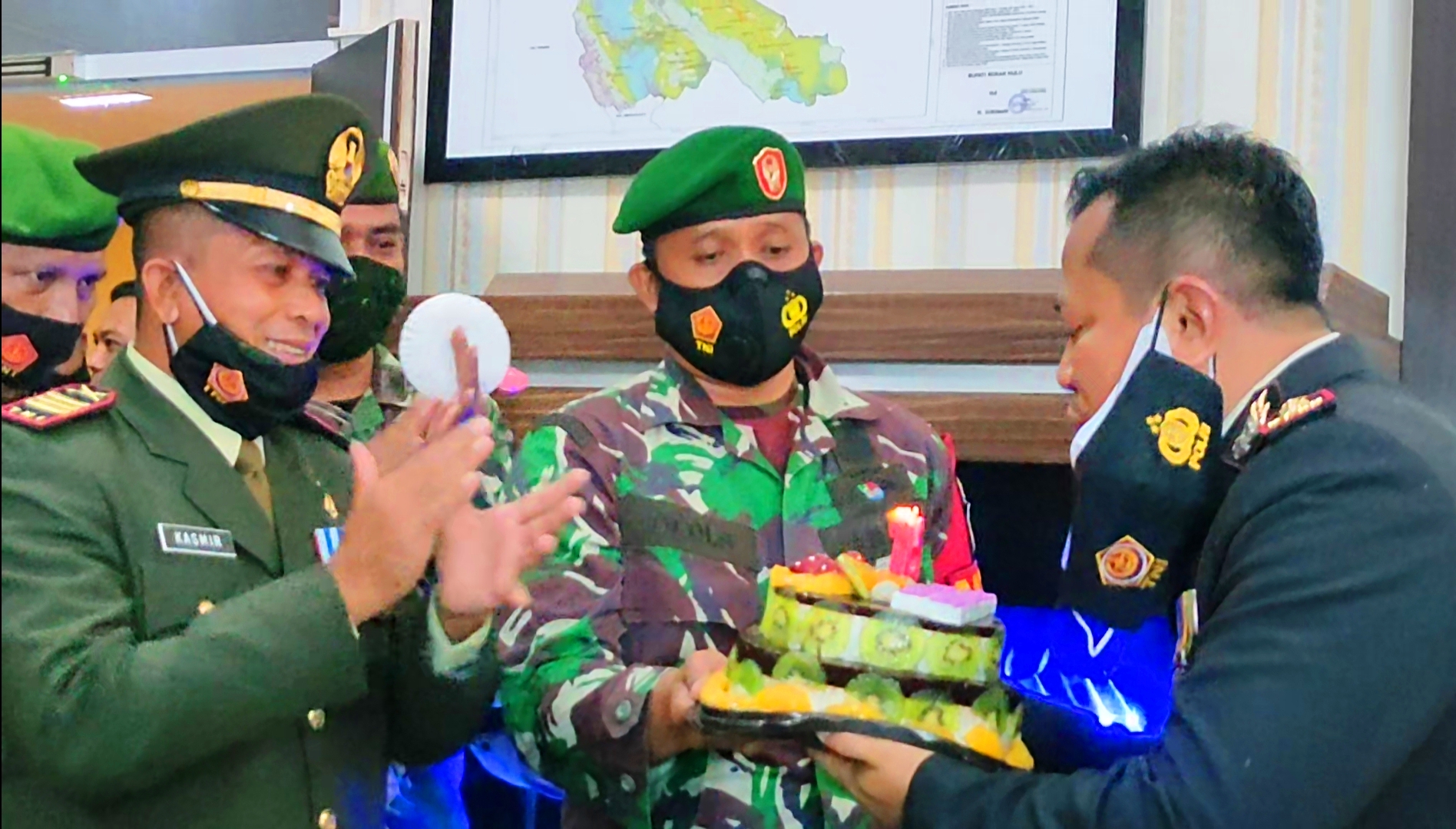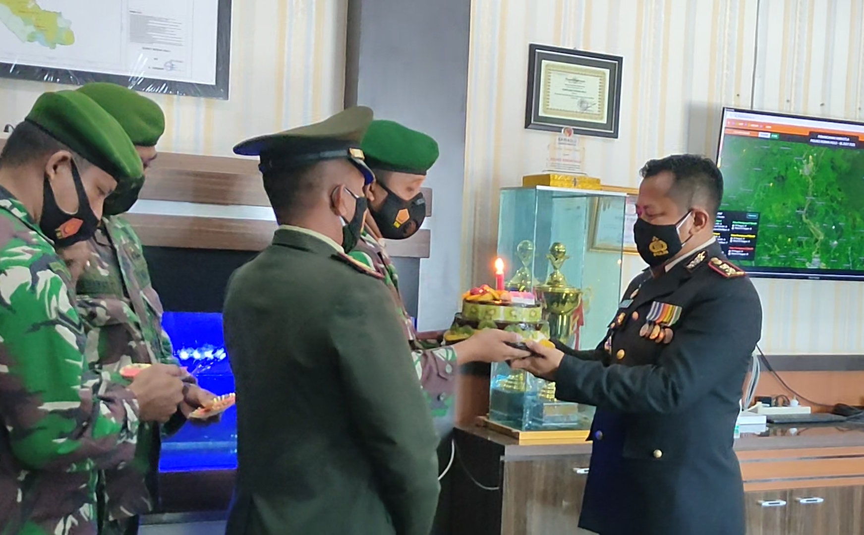 TNI dari Koramil 02 Rambah Kodim 0313/KPR memberikan kejutan ke Markas Polres Rohul.