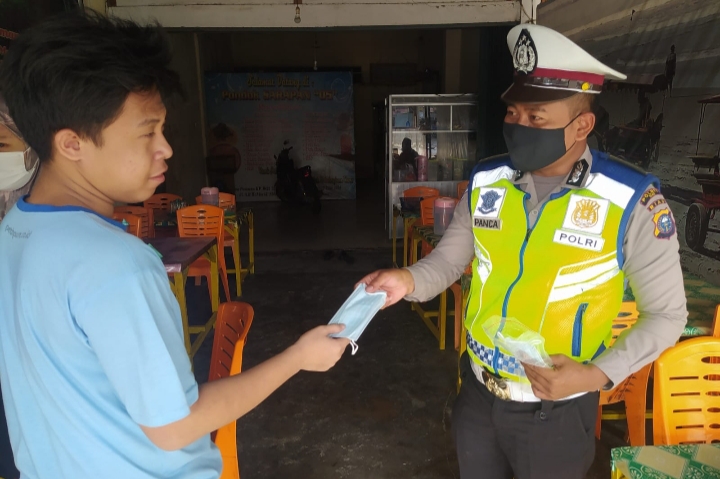 Personil Unit Lantas Polsek Tualang saat membagikan masker kepada pengendara maupun pedagang kaki lima dalam rangka Operasi Zebra Lancang Kuning 2021.
