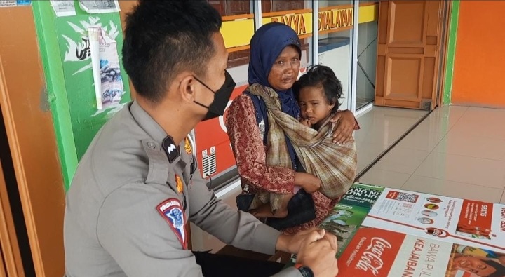 Dewi (38) dan anaknya di datangi Personil Satlantas Polres Siak.