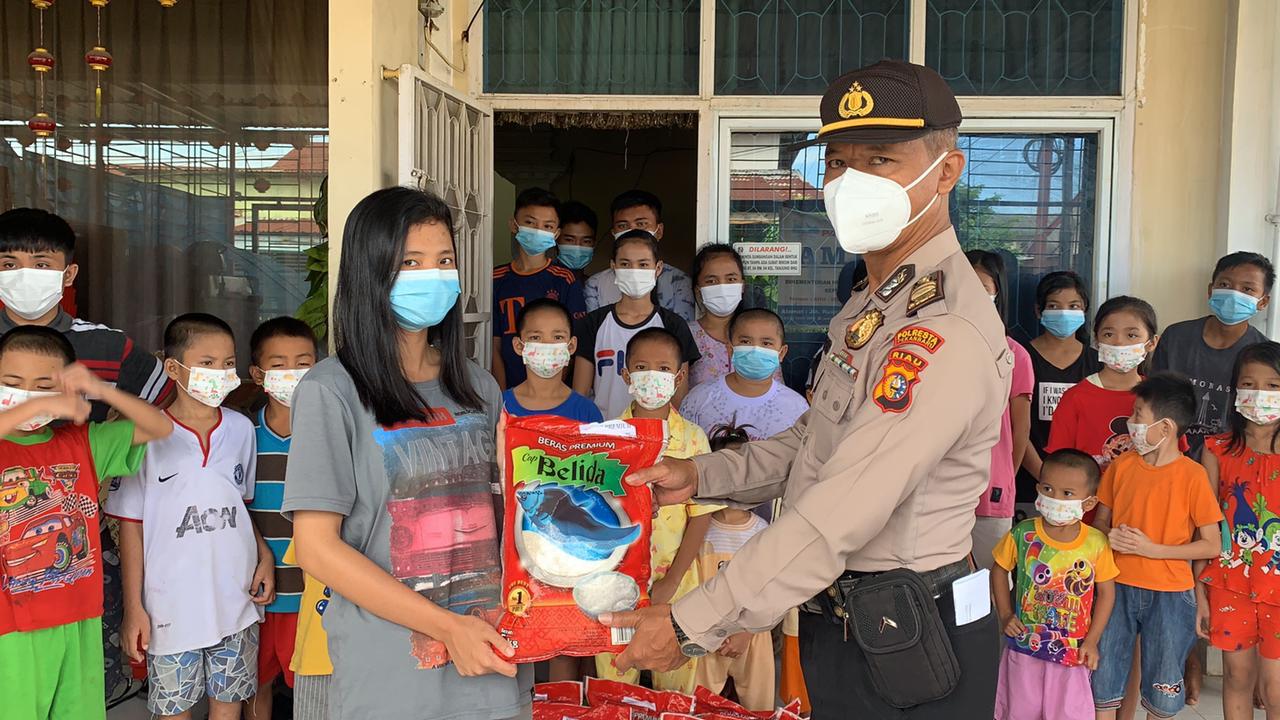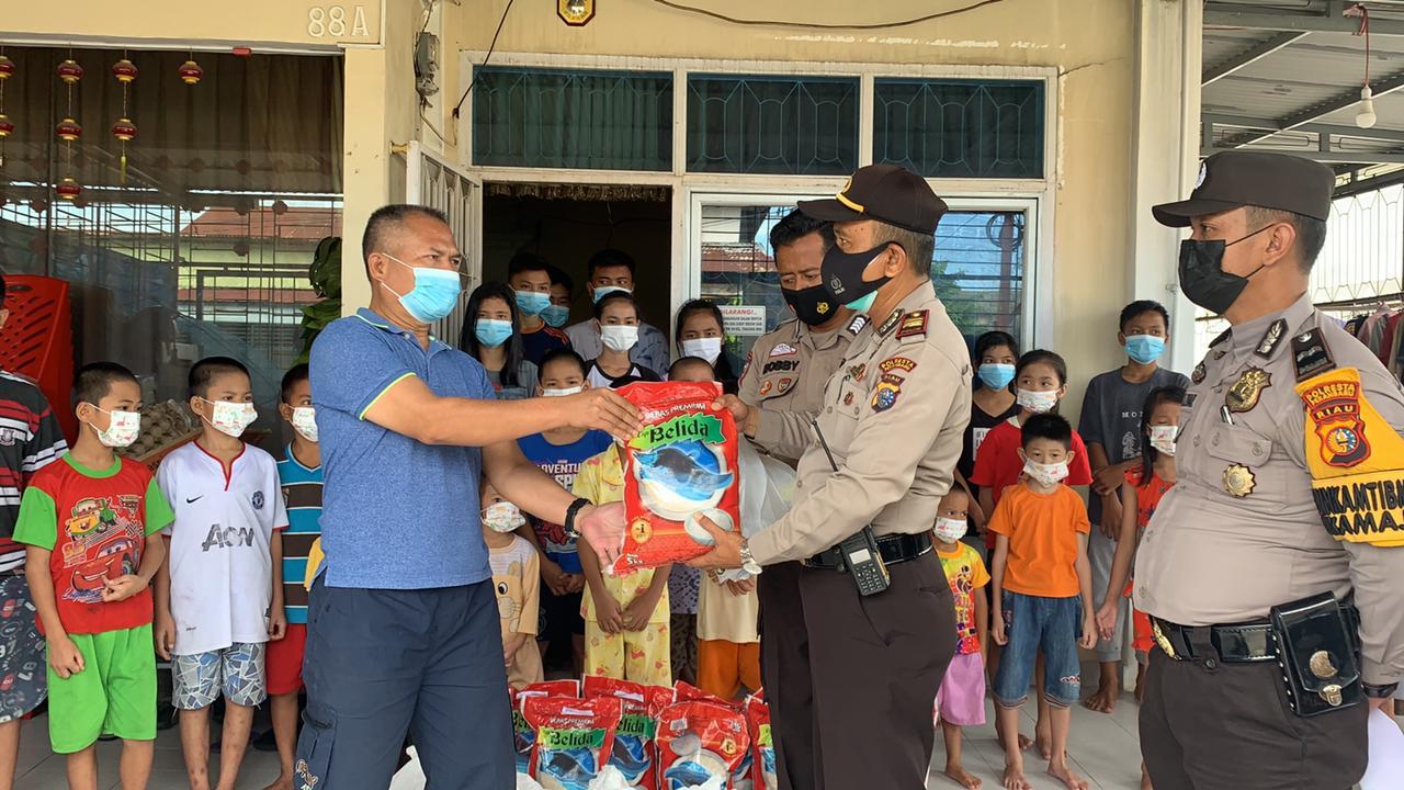 Kapolsek Limapuluh Polresta Pekanbaru beserta jajaranya foto bersama dengan anak-anak panti asuhan penerima sembako.