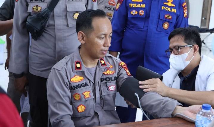 Wakapolres Siak Kompol Angga Wahyu Prihantoro saat periksa tensi dan tekanan darah sebelum bhakti sosial kesehatan donor darah.