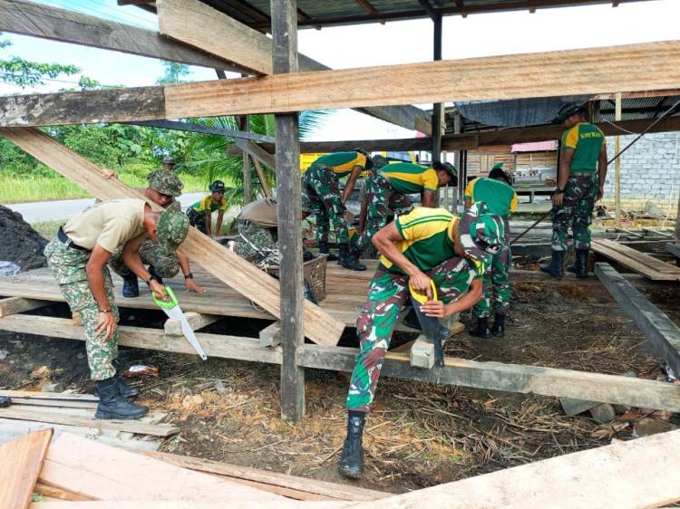 Kegiatan ini berupa gotong royong pembangunan rumah milik pribadi Bapak Rahma, salah satu warga desa yang tengah membangun tempat tinggalnya. Dengan penuh semangat, prajurit Satgas bahu membahu bersama warga, mulai dari pengangkutan material hingga pemasangan atap rumah.