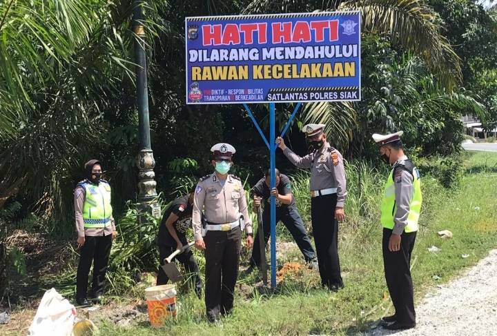 Satlantas Polres Siak memasang spanduk imbauan dibeberapa titik rawan kecelakaan lalu lintas di Kecamatan Minas.