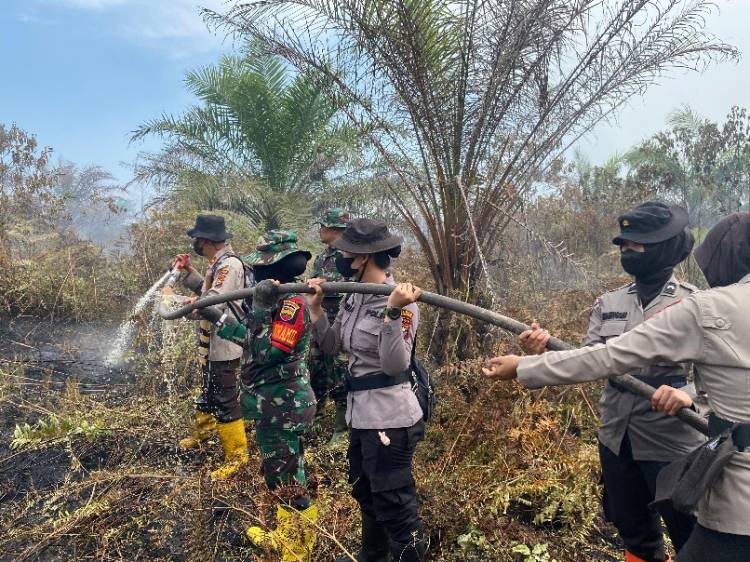 Srikandi Danramil dan Polwan Polres Rohil ikut Memadamkan Api di Rohil