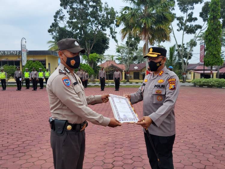 UJUNG TANJUNG, datariau.com - Kapolres Rokan Hilir AKBP Nurhadi Ismanto SH SIK memberikan reward atau penghargaan kepada personel Bhabinkamtibmas yang berprestasi dalam menyukseskan program percepatan vaksin dari pagi hingga malam serta hari libur secara door to door.