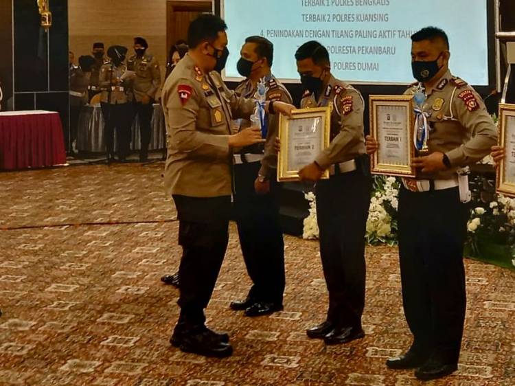 Foto : Kapolda Riau Irjen Pol M Iqbal Saat Memberikan Penghargaan Kepada Kasatlantas Polres Kuansing AKP Rivandy, Senin (24/1/2022).