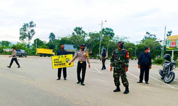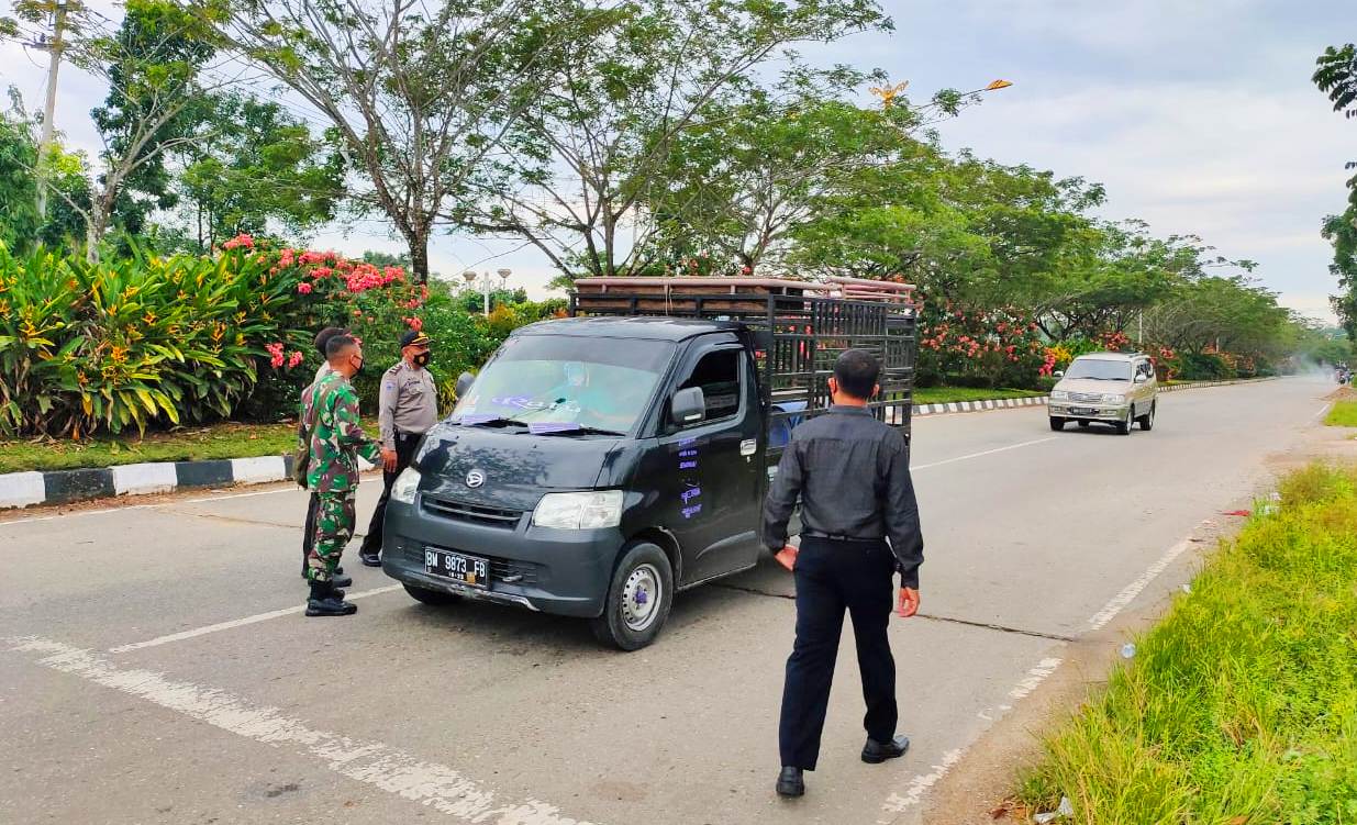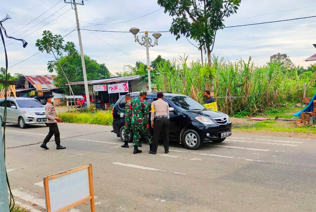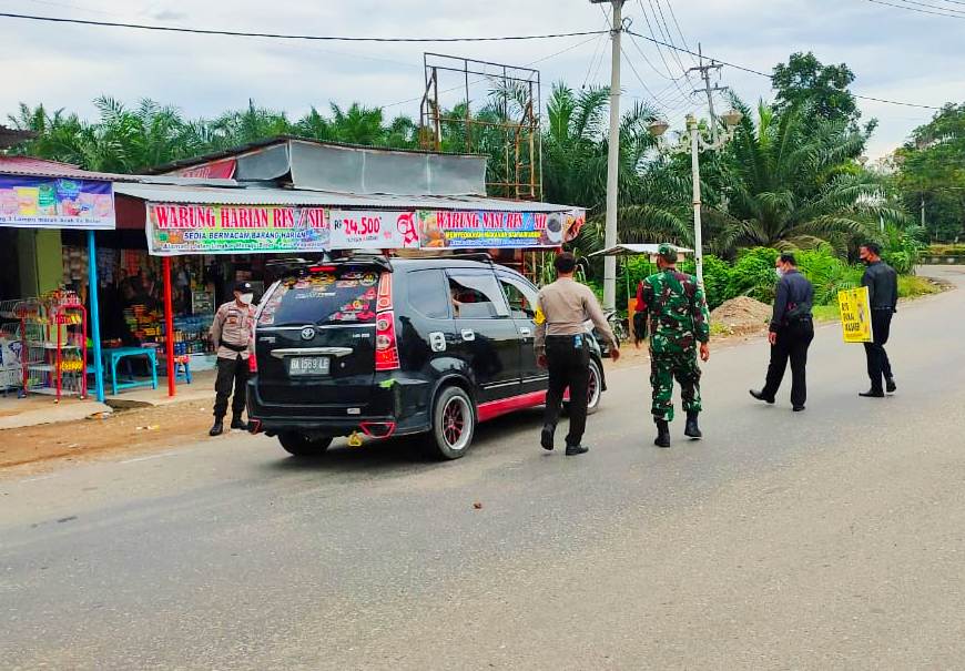 Petugas gabungan TNI POLRI melakukan Kegiatan Rutin Yang Ditingkatkan (KRYD) di jalan Simpang Tiga Boter Desa Pematang Berangan Kecamatan Rambah Kabupaten Rokan Hulu, Selasa (18/5/2021).