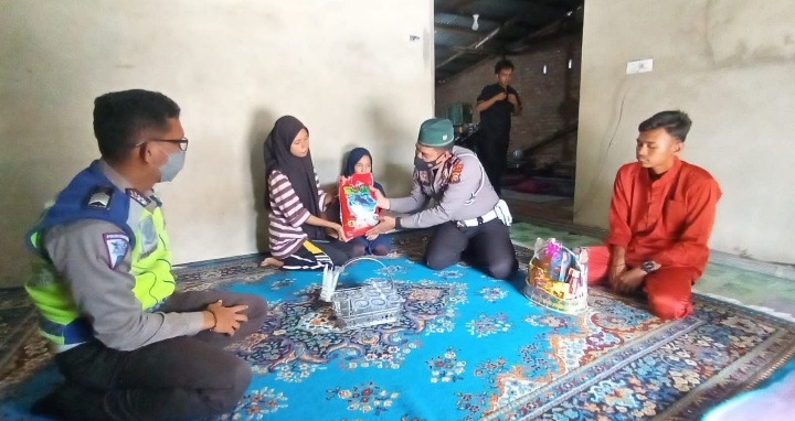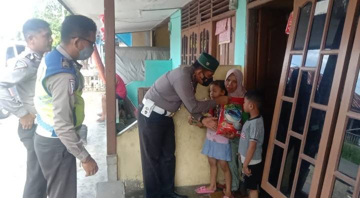 Kapolsek Tualang, AKP alvin Agung Wibawa SIK melalui Kanit Lantas Polsek Tualang, Iptu A Ramadhan SH MSi menyerahkan bantuan paket sembako giat Jumat Barokah.