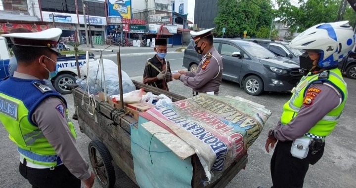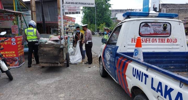 Tim Jumat Barokah Unit Lantas Polsek Tualang Polres Siak menghampiri Yunasir (76), lansia berprofesi mencari barang bekas.
