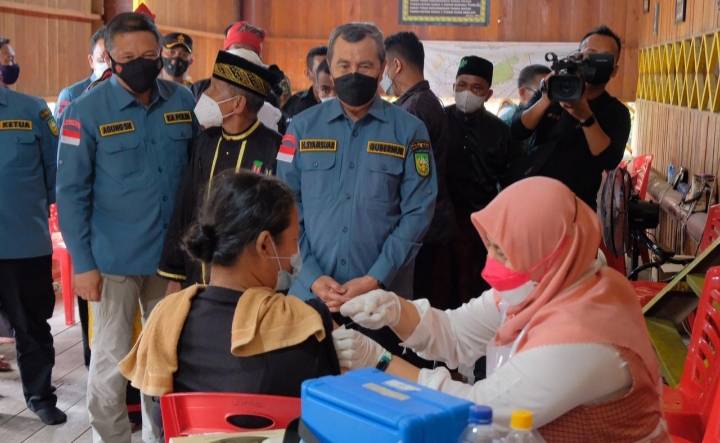 BENGKALIS, datariau.com - Kapolda Riau Irjen Pol Agung Setia Imam Effendi SIK bersama Gubernur Riau H Syamsuar MSi, Ketua DPRD Provinsi Riau H Yulisman, Kajati Riau DR Djaja Subagja serta Danrem 031/WB Brigjen TNI M Syech Ismed tinjau pelaksanaan vaksinasi bagi masyarakat tidak memiliki NIK di Batin Solapan Bengkalis Riau, Sabtu (14/8/2021).