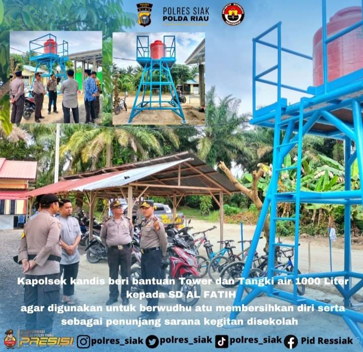 Kali ini, 'Program Polisi Penolong' menyambangi salah satu lembaga pendidikan Yayasan SD Islam Al Fatih Kelurahan Telaga Samsam Kecamatan Kandis dengan memberikan bantuan tower air berikut dengan tanki kapasitas 1000 liter.