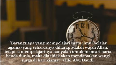 “Barangsiapa yang mempelajari suatu ilmu (belajar agama) yang seharusnya diharap adalah wajah Allah, tetapi ia mempelajarinya hanyalah untuk mencari harta benda dunia, maka dia tidak akan mendapatkan wangi surga di hari kiamat.” (HR. Abu Daud no. 3664, Ibnu Majah no. 252 dan Ahmad 2: 338. Syaikh Al Albani mengatakan bahwa hadits ini shahih).