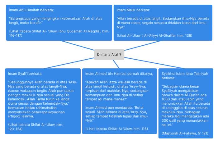 Imam Ahmad bin Hambal pernah ditanyakan, “Apakah Allah ‘azza wa jalla berada di atas langit ketujuh, di atas ‘Arsy-Nya, terpisah dari makhluk-Nya, sedangkan kemampuan dan ilmu-Nya di setiap tempat (di mana-mana)?” Imam Ahmad pun menjawab, “Betul sekali. Allah berada di atas ‘Arsy-Nya, setiap tempat tidaklah lepas dari ilmu-Nya.” (Lihat Itsbatu Shifat Al-‘Uluw, hlm. 116).
