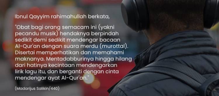 “Obat bagi orang yang semacam ini (yakni pecandu musik), hendaknya dia berpindah sedikit demi sedikit mendengar bacaan Alquran dengan suara merdu (Murrotal), disertai memerhatikan dan memahami maknanya, menadabburinya, hingga hilang dari hatinya kecintaan mendengar lirik lagu itu, dan berganti dengan cinta mendengar ayat Alquran.” [Madarikus Salikin/440].
