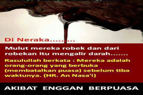 “Ketika tengah tidur, aku didatangi oleh dua orang laki-laki lalu keduanya menarik lenganku dan membawaku ke gunung yang terjal seraya berkata: ‘Naiklah.’ Lalu kukata-kan: ‘Sesungguhnya aku tidak sanggup melakukannya.’ Selanjutnya, keduanya berkata: ‘Kami akan memudahkan untukmu.’ Maka aku pun menaikinya sehingga ketika aku sampai di kegelapan gunung tiba-tiba ada suara yang keras sekali, maka kutanyakan: ‘Suara apa itu?’ Mereka menjawab: ‘Itu adalah jeritan para penghuni Neraka.’ Kemudian dia membawaku berjalan dan ternyata aku sudah bersama orang-orang yang bergantungan pada urat besar di atas tu-mit mereka, mulut mereka robek, dan robekan itu menga-lirkan darah.’ Aku berkata, ‘Siapakah mereka itu?’ Dia menjawab: ‘Mereka adalah orang-orang yang yang ber-buka sebelum waktu berbuka…“[3]
