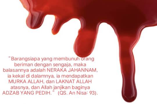 “Barangsiapa yang membunuh orang beriman dengan sengaja, maka balasannya adalah NERAKA JAHANNAM, ia kekal di dalamnya, ia mendapatkan MURKA ALLAH, dan LAKNAT ALLAH atasnya, dan Allah janjikan baginya ADZAB YANG PEDIH.” (QS. An Nisa: 93).