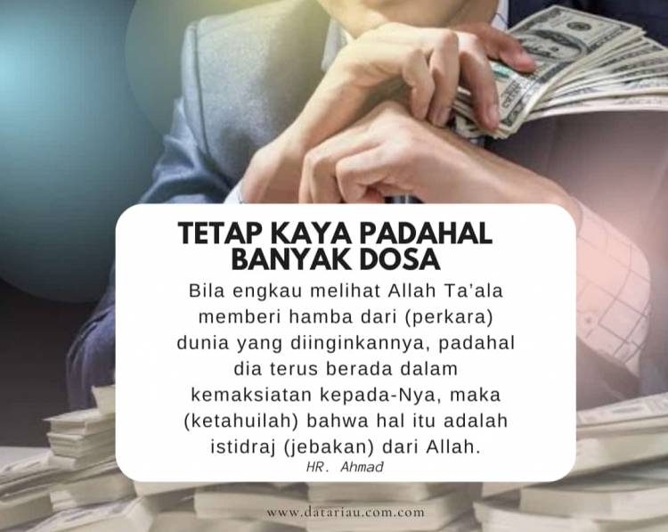 DATARIAU.COM - Ada yang harus kita waspadai, yaitu ia merasa bahagia di dunia padahal itu adalah hukuman baginya dari Allah Ta’ala, karena ia bahagia tidak di atas landasan Agama Islam yang benar. Allah biarkan ia bahagia sementara di dunia, Allah biarkan ia merasa akan selamat dari ancaman Allah di akhirat kelak, Allah tidak peduli kepadanya. Itulah istidraj sebagaimana yang dijelaskan oleh Rasulullah shallallahu ‘alaihi wa sallam, beliau bersabda,