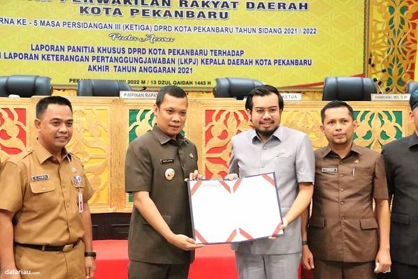 Wakil Ketua DPRD Kota Pekanbaru Ginda Burnama ST, saat menyerahkan draft Laporan Pansus DPRD tentang LKPj Kepala Daerah TA 2021 kepada Pj Walikota Pekanbaru Muflihun.