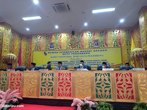 PEKANBARU, datariau.com - DPRD Pekanbaru menggelar Rapat Paripurna Pengucapan Sumpah/Janji Pergantian Antar Waktu (PAW) Ketua DPRD Pekanbaru Sisa Masa Jabatan 2019-2024 atas nama Muhammad Sabarudi ST dari Fraksi PKS, di Ruang Paripurna Gedung Balai Payung Sekaki, Selasa (21/6/2022).